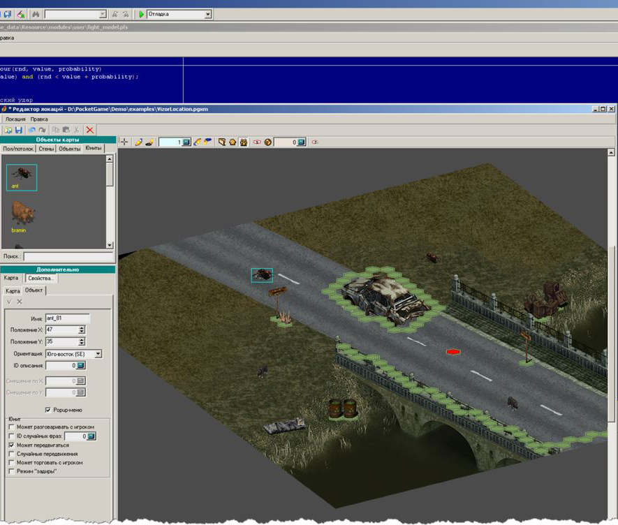 For that game engine wad developed own script language (based on Lua syntax) and IDE tools (made with Delphi 7).