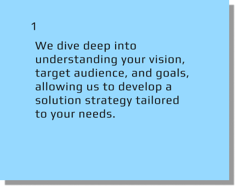 We dive deep into understanding your vision, target audience, and goals, allowing us to develop a solution strategy tailored to your needs.