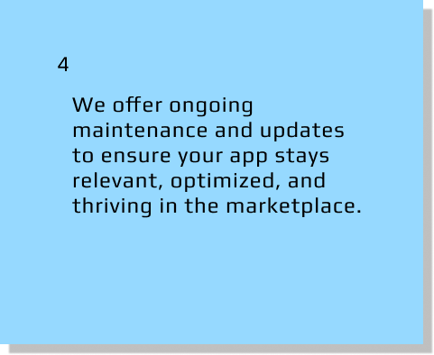 We offer ongoing maintenance and updates to ensure your app stays relevant, optimized, and thriving in the marketplace.