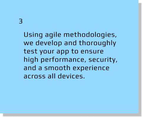 Using agile methodologies, we develop and thoroughly test your app to ensure high performance, security, and a smooth experience across all devices.